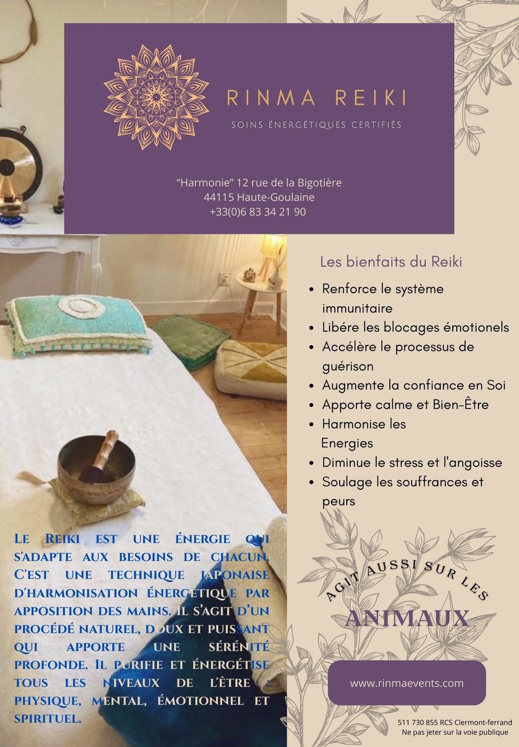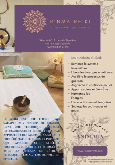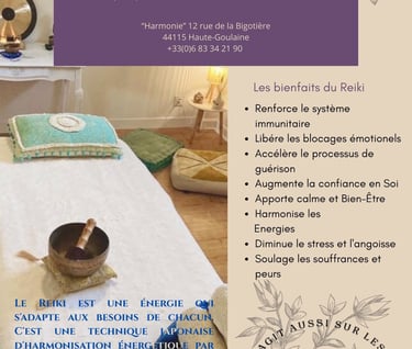 Le Reiki est une énergie qui s'adapte aux besoin de chacun. C'est une technique japonaise d'harmonisation énergétique par apposition des mains. Il s'agit d'un procédé naturel. doux et puissant qui apporte une sérénité profonde. Il purifie et énergétise tous les niveaux de l'être : physique, mental. émotionnel et spirituel.